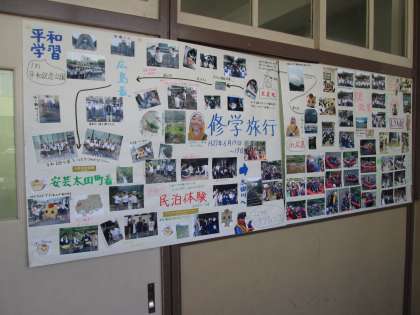 3年の教室前の廊下や学習室には、思い出の修学旅行の写真が・・・。