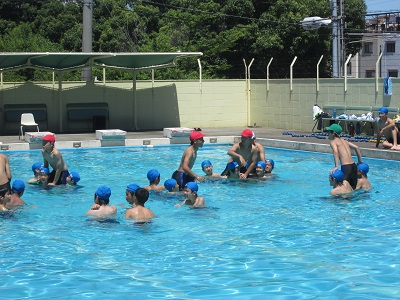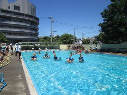 水中だとバランスを保つのが大変ですが、クラス対抗戦は男子から始まりました。