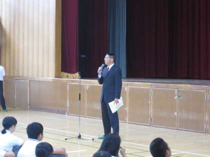 皆さん、こんにちは。明日は台風で休みになる恐れもありますので、本日、終業式として、話をします。
