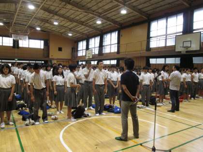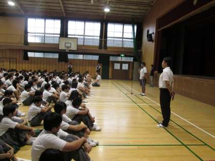 昨日、終業式は終えていますので、全校集会を開いて、校長講話と生徒指導主事からの諸注意をし、学年ごとに下校となりました。