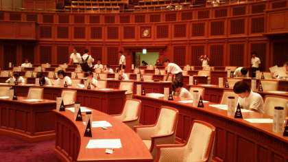 本日、市役所にある市会の会議場に、子ども市会の意見交流会にやって来ました。