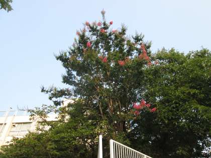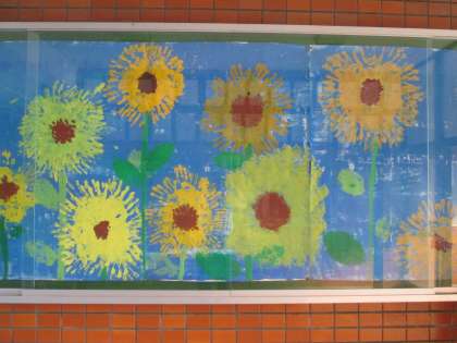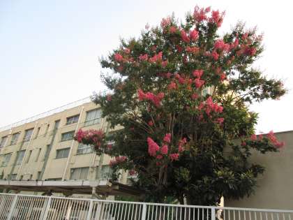 玄関の美術部の作品。大きなひまわりが満開です。正門と南門の百日紅も、ピンクの満開が日に日に近づいてきました。