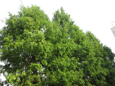 中庭のメタセコイヤの樹木。朝から蝉の鳴き声が響いています。