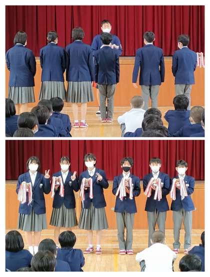 先生からは色んな人の個性を生かして2年生でも周りを大切にすることや朝の登校時間について、マラソン大会個人賞のトロフィー授与、卒業式についてのお話がありました。
