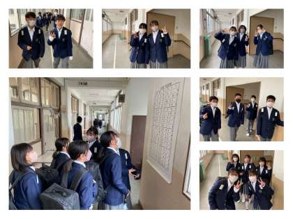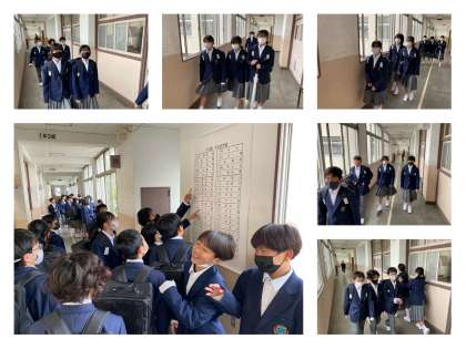 登校後、廊下に貼られた名列表から自分の名前を探しています。