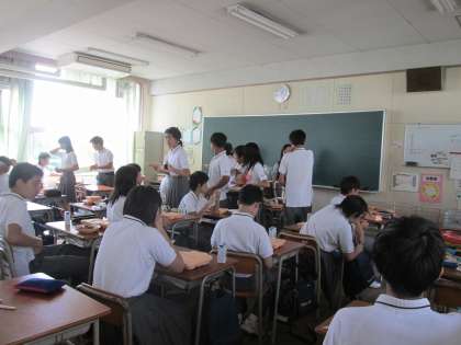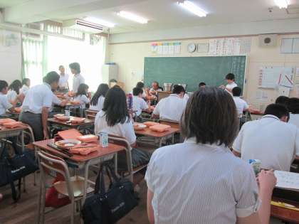 教室では、配膳のあと、「いただきます」!のあいさつで、みんな一斉に給食を食べています。もちろん、先生方も一緒です。