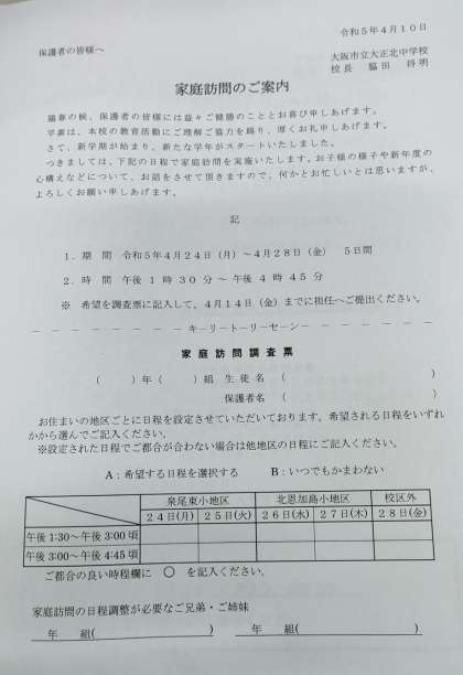 本日の手紙で家庭との連絡方法、家庭訪問があります。