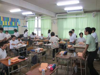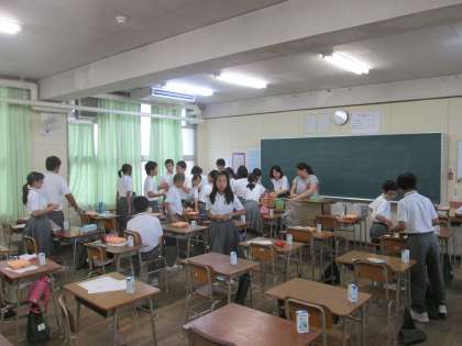 1年生の教室。係りが配膳室前から教室まで、ご飯、おかず、牛乳をカゴごと運び、教室で各自の配膳をして、「いただきます」になります。