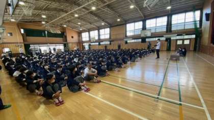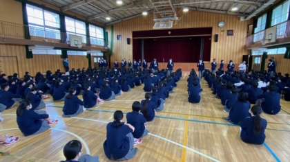 その後、1年生がその場で学年集会を開き、諸注意を行いました。皆さん、姿勢良く聞くことができています。