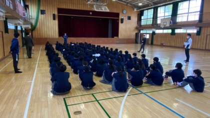 4月17日(月)、朝の全校集会の様子です。生活指導について、担当の先生から、登校の事、交通安全の事、学習系端末の使用の事をお話しました。