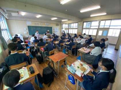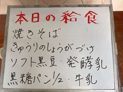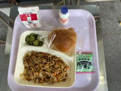 今日の給食は、焼きそば、きゅうりの生姜漬け、ソフト黒豆、発酵乳です。パンは黒糖パンです。