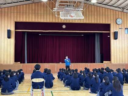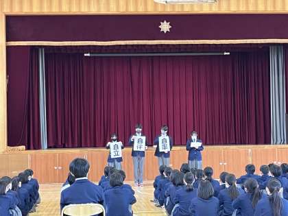 学級代表が考えてくれた今年度の学年目標を発表してもらいました。「自立・自律・自率」。1年間自分を奮い立たせましょう。