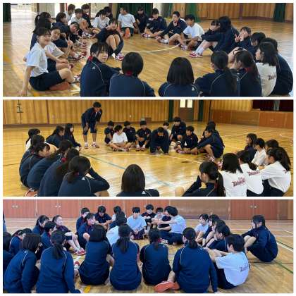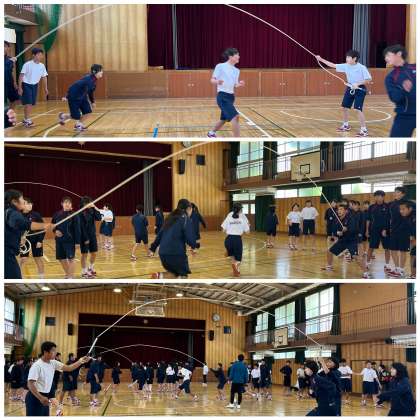 体育館の建て替え工事で取り壊される体育館に感謝の気持ちを込め、今週の体育の時間で全力スポーツ大会を行います。初日の今日は大縄跳びを行いました。明日の王様ドッヂボールの作戦をクラスで考え、良い案に笑顔が光りました。