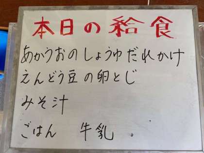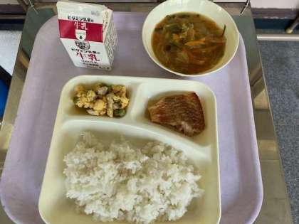 今日の給食は、赤魚の醤油だれかけ、味噌汁、えんどうの卵とじです。