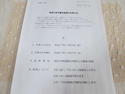 先日、ご案内を配布いたしましたが、体育大会の予備日の変更をお伝えいたします。