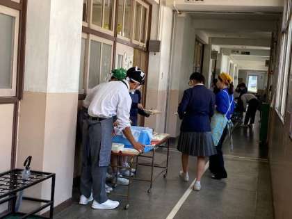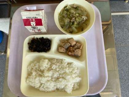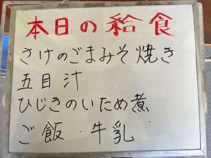 学校では2.3年生が、通常どおり授業をうけ、給食を食べています。今日の給食は、鮭の胡麻味噌焼き、五目汁、ひじきの炒め煮です。