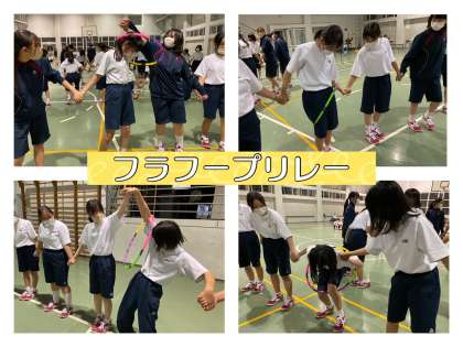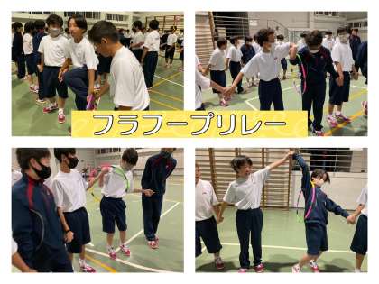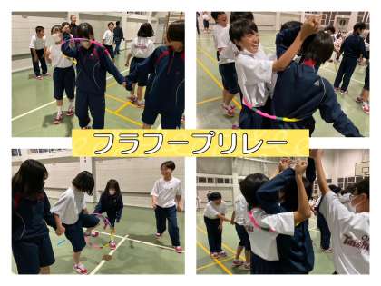 2組の男子は小さなフラフープに3人も!
