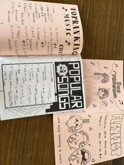 バスレク係さんがバスで流す曲をアンケートにとり、それをもとに一つの冊子を制作してくれました。バスの中も楽しみです。