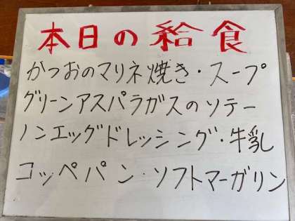 今日の給食は、かつおのマリネ焼き(ノンエッグドレッシング)、スープ、グリーンアスパラガスのソテーです。パンにはマーガリンがついています。