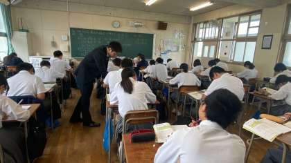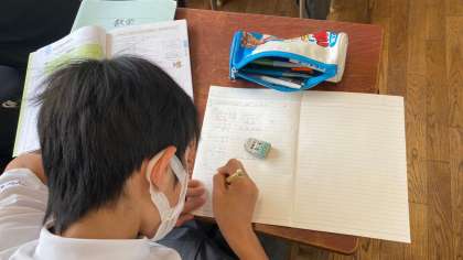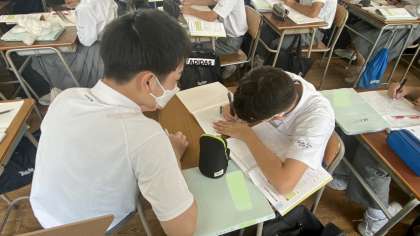 例題で解法を学んだ後、さあ、練習問題に!皆さん、なかなか良いですよー^_^。。。あ、間違ってるなー。どこで計算ミスをしているのか?お互いに確認しています。