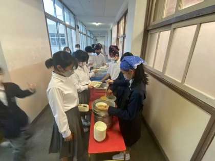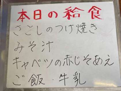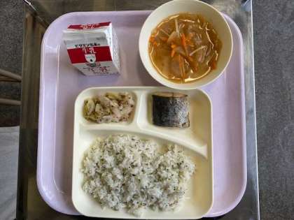 今日の給食は、さごしの漬け焼き、味噌汁、キャベツの赤じそ和えです。