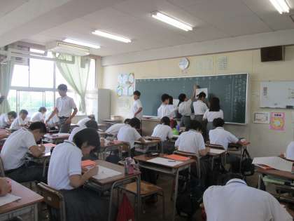 2年の国語。徒然草が教材です。黒板に生徒たちが調べた意味を書き込んでいます。