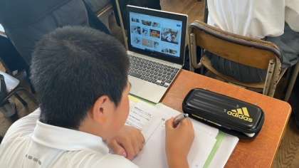 1年生2組では動物の体について、学んでいます。パソコンで、猫を調べているようです。猫って、体、柔らかいですよねー。