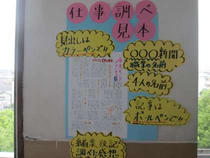 1年ではキャリア教育で、「仕事調べ」の新聞を班ごとに作成します。