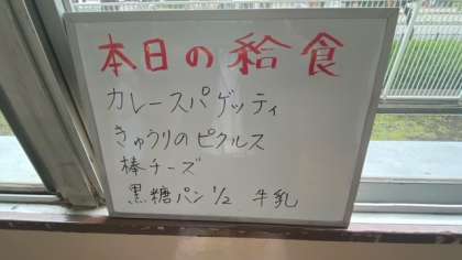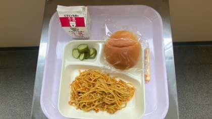 今日の給食は、カレースパゲティー、きゅうりのピクルス、棒チーズです。パンは黒糖パンです。