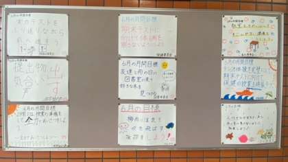 3年生は「実力テストを振り返りながら、前に進もう」。2年生は「提出物を出す。気合いを出す。声を出す。」。1年生は「2分前には授業の準備をして、全力で挨拶をしよう」。です。