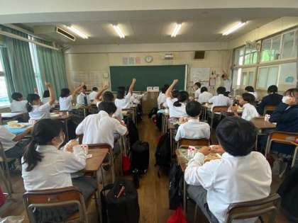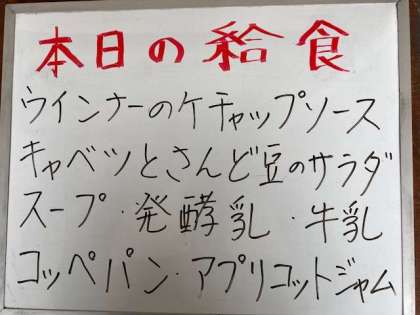 今日の給食は、ウィンナーのケチャップソース、スープ、キャベツと三度豆のサラダ、発酵乳です。アプリコットジャムが付いています。