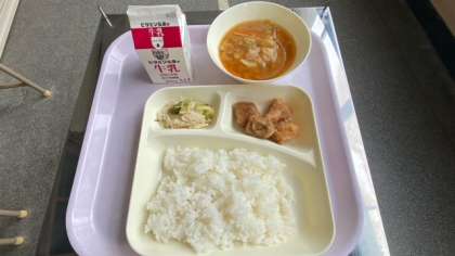 今日の給食は、豚肉の竜田揚げ、味噌汁、切り干し大根の柚子の香和えです。