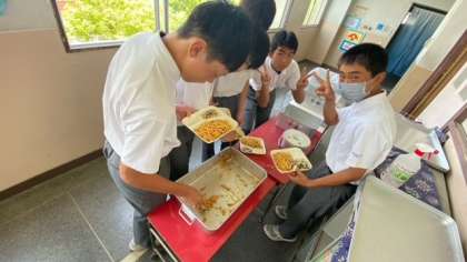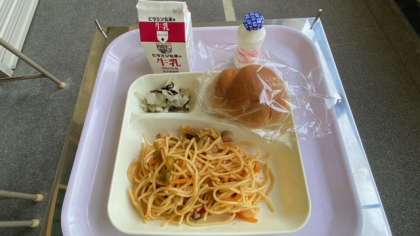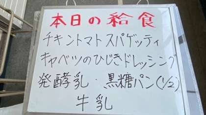 今日の給食は、チキントマトスパゲティー、キャベツのひじきドレッシング、発酵乳です。パンは黒糖パン2分の1の大きさです。