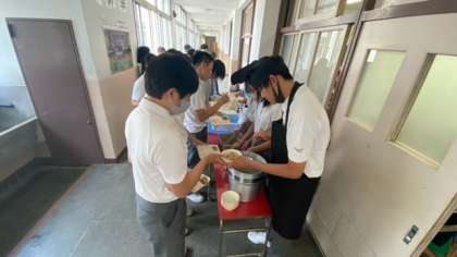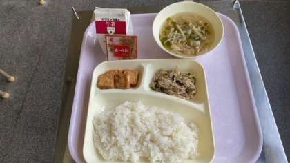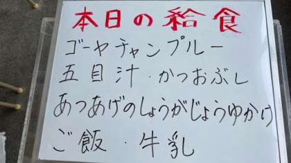 今日の給食は、ゴーヤチャンプル、五目汁、厚揚げの生姜じょうゆかけです。