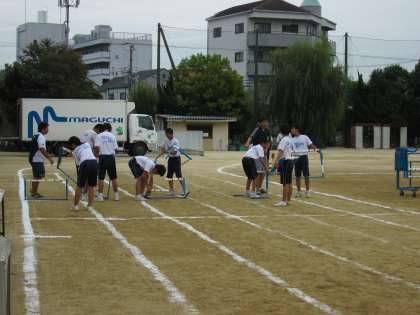道具の準備係が、ハードル走の準備を行っています。