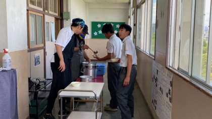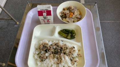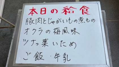 今日の給食は、豚肉とじゃがいもの煮物、オクラの梅風味、ツナっ葉炒めです。
