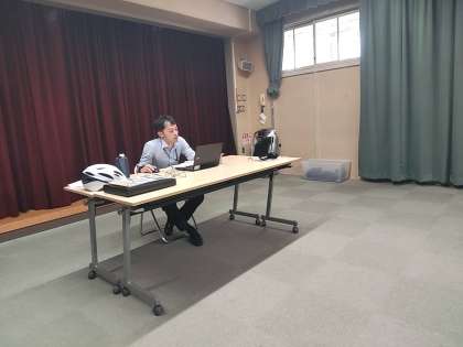 体育館建て替え工事のため、多目的室から各教室へTeams配信でお話しいただきました。