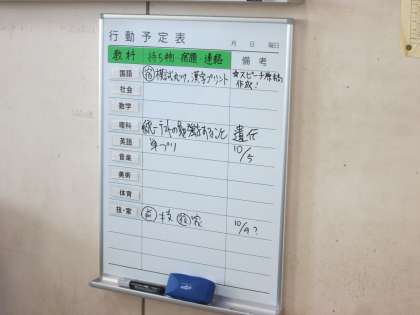 各教科からの宿題や連絡が、教室でわかるように設置されたホワイトボード。