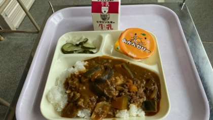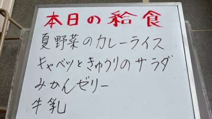 今日の給食は、夏野菜のカレーライス、キャベツときゅうりのサラダ、みかんゼリーです。