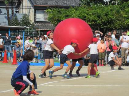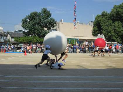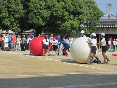 大玉を転がす定番ではなく、4人で腕をいっぱいに伸ばして運びます。