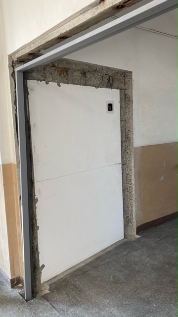 夏休み中に階段の鉄扉を改修しています。壁をくり抜き、2学期までには新たな鉄扉となります。