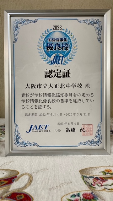 大阪市教育振興基本計画の3つの最重要目標にある「学びを支える教育環境の充実」において、ICTを活用した教育を推進するために、校内のICT環境を整えています。今年度も引き続き、学校情報化優良校に認定されました。