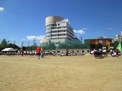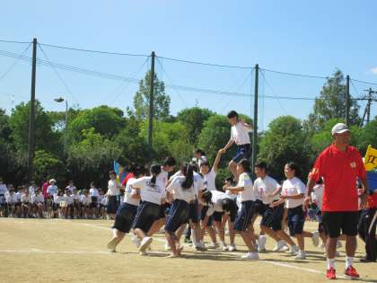 みんなで馬とび風に土台をつくり、代表生徒が背中を素早く、渡って行きます。