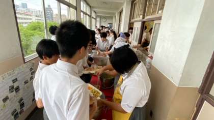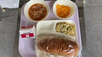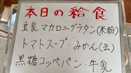 今日の給食は、豆乳マカロニグラタン、トマトスープ、みかん(缶)です。