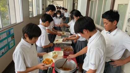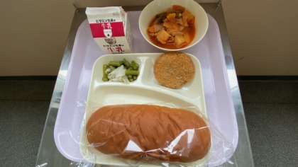 今日の給食は、チキンレバーカツ、ケチャップ煮、グリーンアスパラガスとキャベツのサラダです。パンは黒糖パンです。
