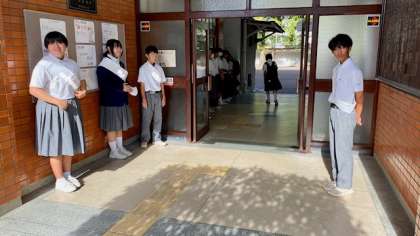 生徒会役員の立候補者が玄関前に立ち、登校する生徒の皆さんに呼びかけていました。