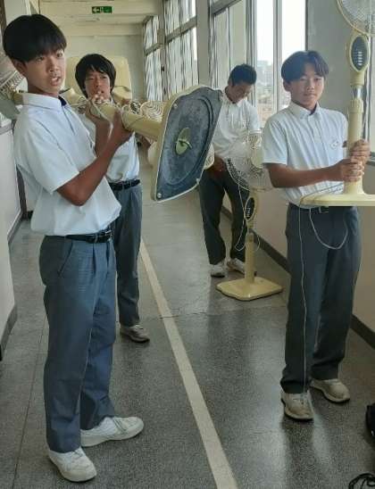 エアコンのない格技室を少しでも涼しくするために扇風機をラグビー部とソフトテニス部が運んでくれました。