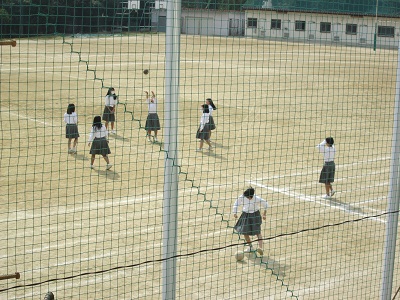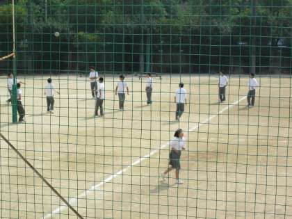 グラウンドで生徒たちがボールを使って遊んでいる風景。