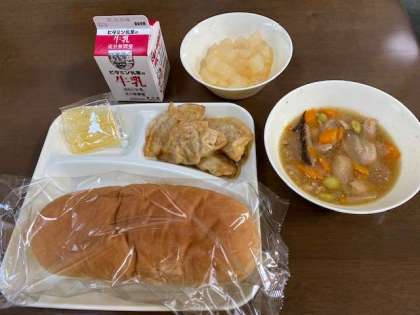 今日の給食は、揚げ餃子、鶏肉と冬瓜の中華煮、和梨(カット缶)です。パンにはマーマレードがついています。