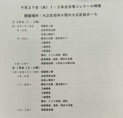 体育館工事に伴い、今後の部活動や卒入学式でも大正区民ホールをお借りすることなっており、ご協力ください。